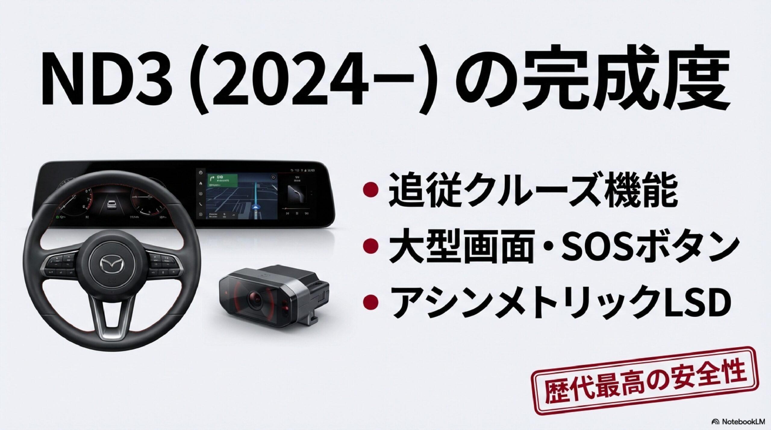 ND3の変更は多岐にわたります。電子プラットフォーム(車載通信基盤)の全面刷新、新デザインのヘッドランプ・リアランプ、マツダ・レーダー・クルーズ・コントロール(MRCC)の新規採用、新開発アシンメトリックLSD、電動パワステの制御ロジック刷新、8.8インチフレームレスディスプレイの搭載など、外観から足回り、電子制御、安全装備まで、ほぼ全方位に手が入っています。