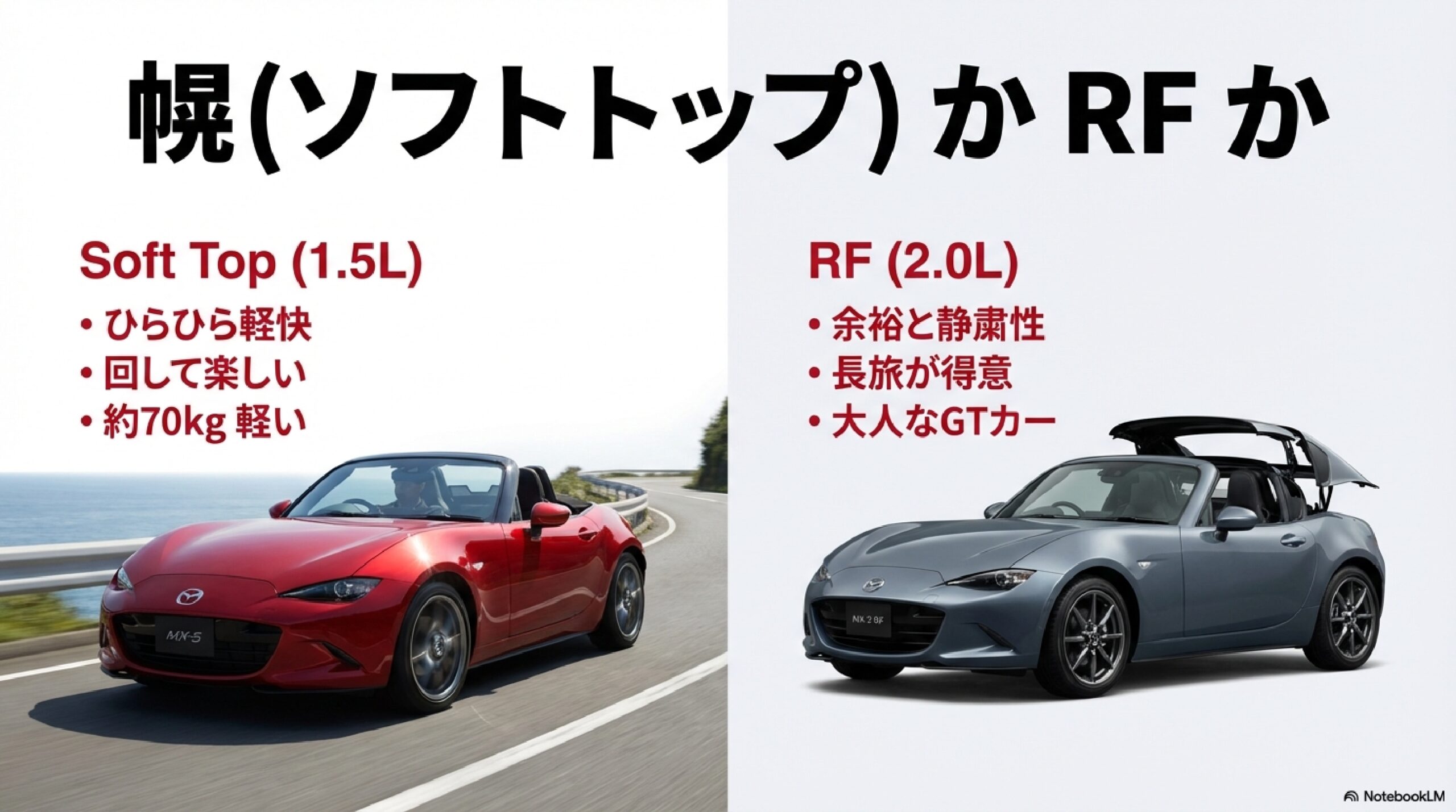 日常の足としても使いたい、遠出も快適にこなしたい、高速道路の移動が多いという方には、2.0L RFが最適な選択肢です。逆に、「日常の実用性よりも純粋な走りの楽しさを最優先したい」という方は、1.5Lソフトトップの方がフィットするでしょう。