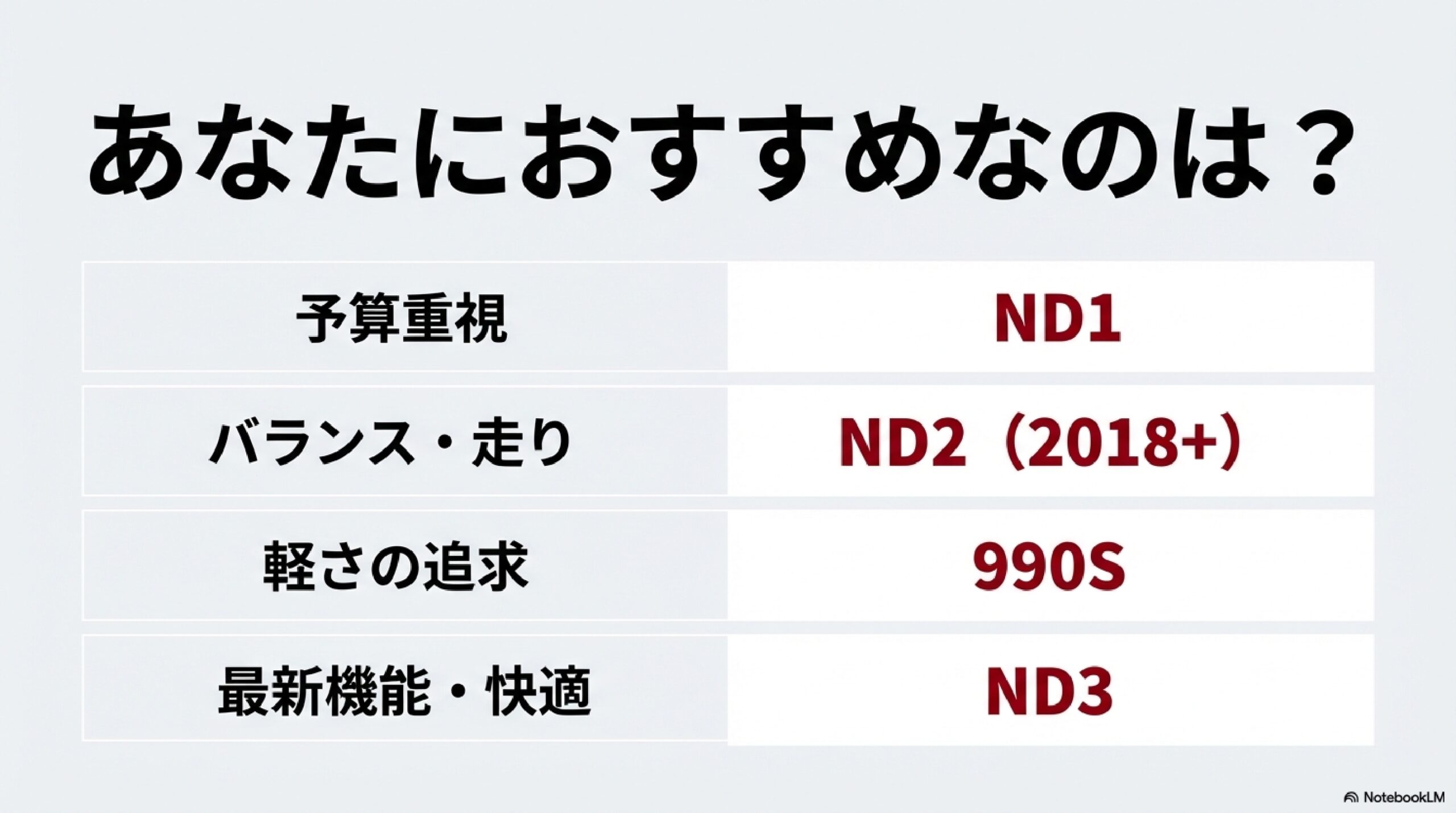 - 990SやRFなど気になるモデルの特徴と選択基準が明確になる