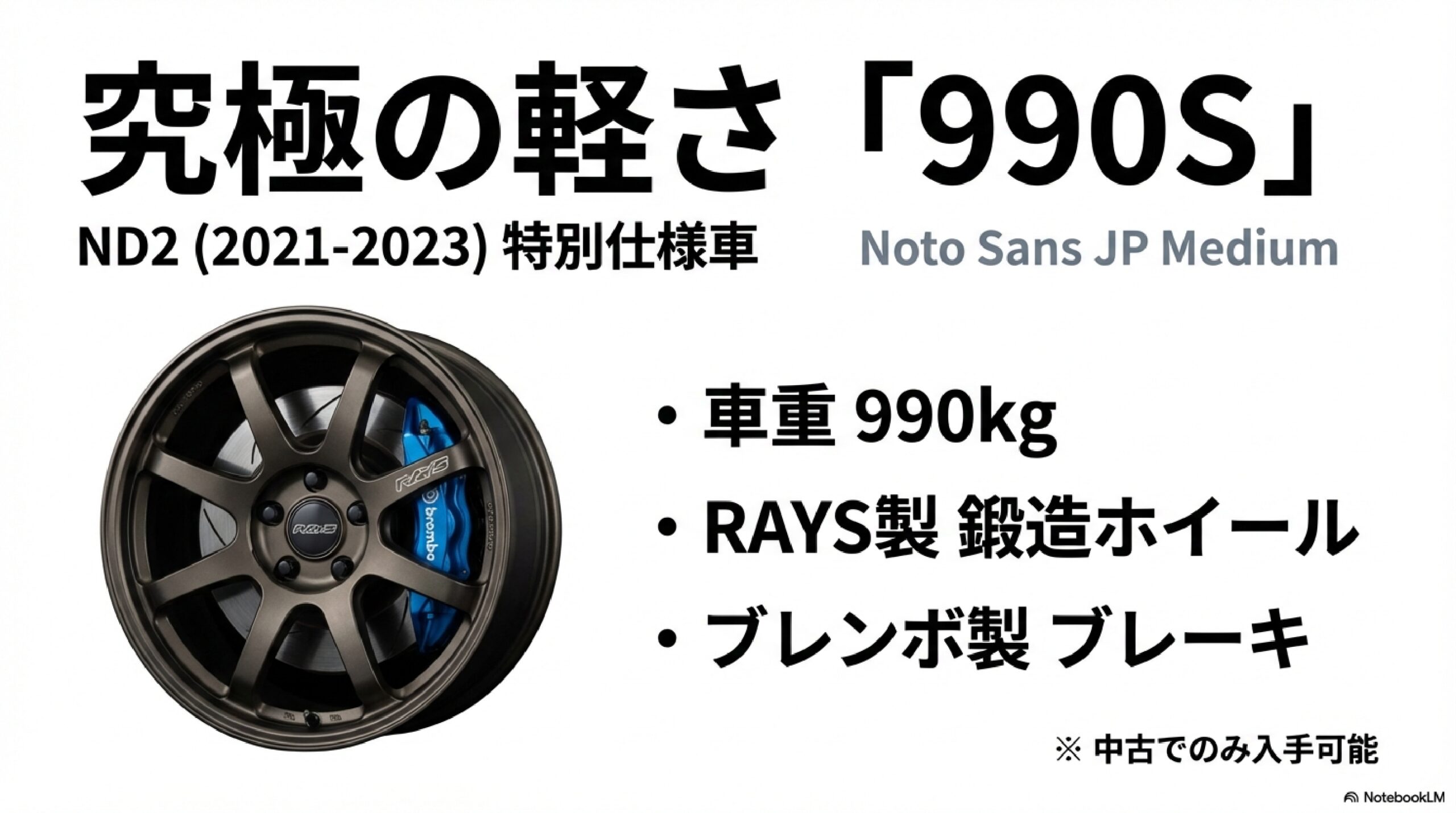 2021年12月に登場した990Sは、NDロードスターの原点である「軽さ」を極限まで追求した特別なモデルです。ベースとなったのは最軽量グレードの「S」で、その名の通り車重990kgを実現しています。1トンを切る車重は、現代の乗用車としては圧倒的な軽さです。
